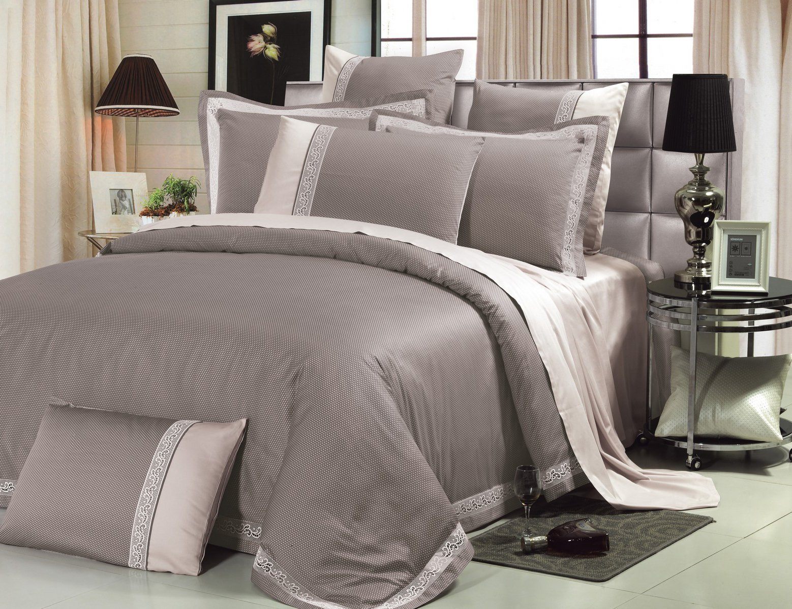 Очаровательный мелкий горох на серо-бежевом фоне настолько гармонично сочетается с белоснежным кружевом, что в этот комплект многие влюбляются с первого взгляда! В нём есть всё: и роскошь, и простота и эксцентричность! Комплект выполнен из 100% ЕГИПЕТСКОГО ДЛИННОВОЛОКНИСТОГО ХЛОПКА – ткань шелковистая, нежная, располагающая к комфортному и приятному сну.