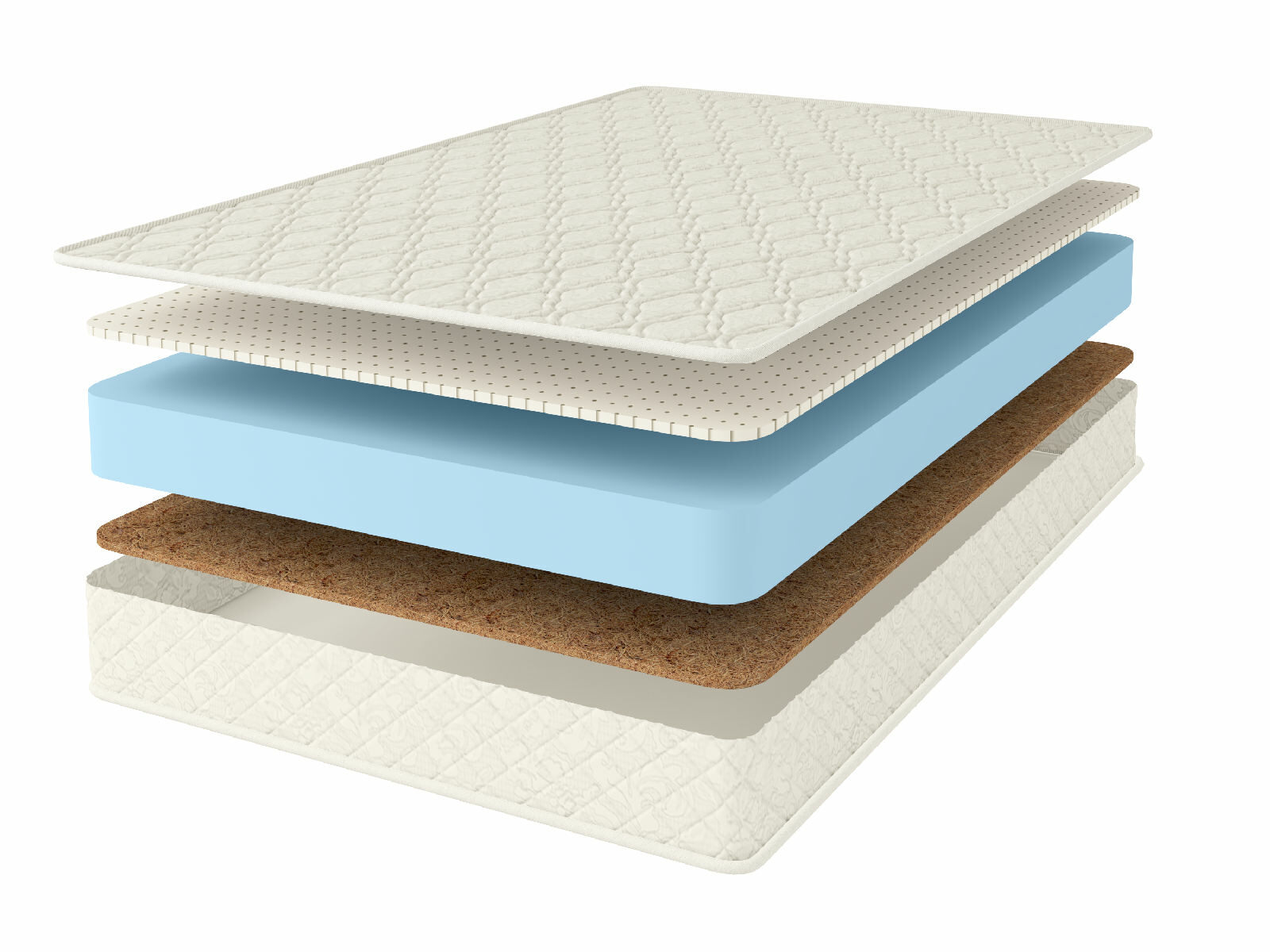 Внутри матрас представлен сразу тремя слоями. Главным наполнителем здесь выступает блок искусственного латекса, его здесь установлено сразу 14 см. В дополнение к нему идут 1 см плиты кокосовой койры и натурального латекса, которые проложены сразу у поверхностей. Таким образом матрас приобретает различную жёсткость – среднюю и высокую.