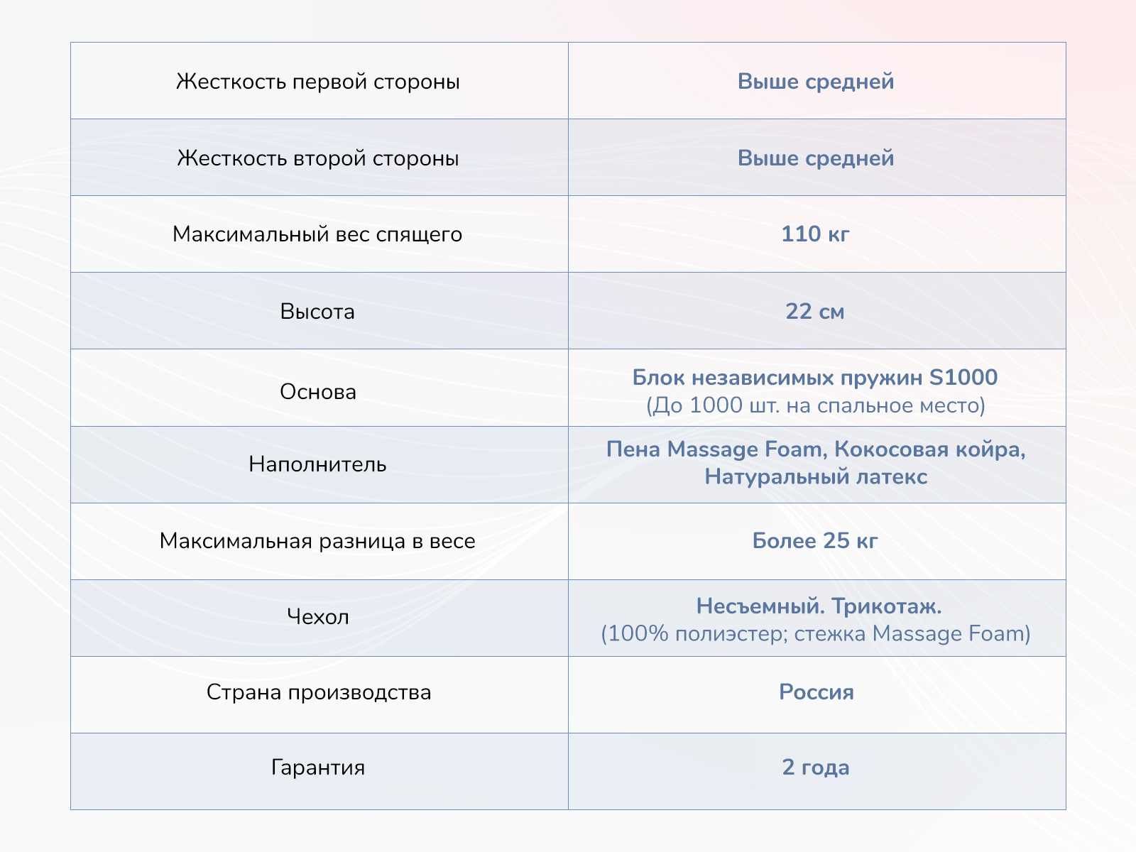 В центре спальной принадлежности установлен усиленный блок пружин. Модель носит название S1000. Квадратный метр блока включает около 500 независимых спиралей, что позволяет добиться высокого качества ортопедической поддержки.