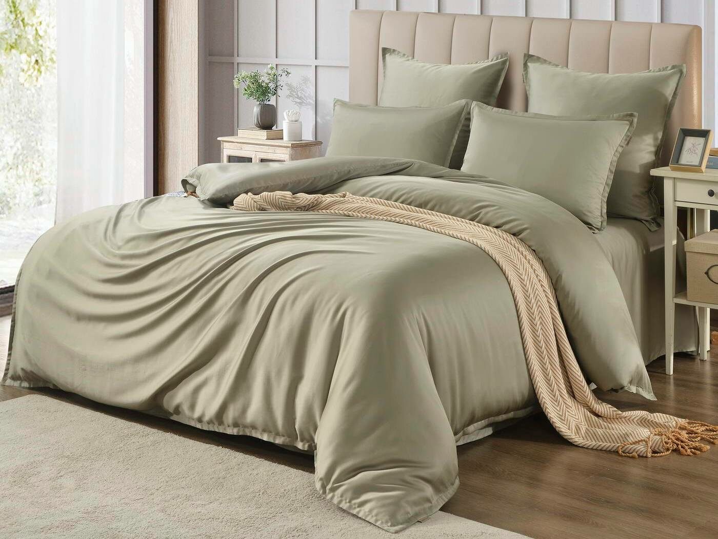 Комплекты постельного белья Ансель: нежность и комфорт каждую ночь Ищете постельное бельё, которое подарит вам незабываемый комфорт и уют? Тогда комплекты постельного белья Ансель из тенселя — идеальный выбор! Тенсель — это натуральная ткань, изготовленная из волокон эвкалипта. Она обладает рядом преимуществ перед хлопковыми тканями: более нежная, шелковистая и приятная на ощупь. Комплекты постельного белья Ансель включают в себя наволочки, простыню и пододеяльник. Они выполнены из 100% тенселя, что гарантирует высокое качество и долговечность. Одно из главных преимуществ тенселя — его способность пропускать воздух и хорошо впитывать и испарять влагу. Это обеспечивает оптимальный микроклимат во время сна, предотвращает появление неприятных запахов и бактерий. Ещё одно важное свойство тенселя — антибактериальный эффект. Это значит, что постельное бельё Ансель не вызывает аллергии и подходит для людей с чувствительной кожей. Уникальное свойство тенселя — климат-контроль. При высокой температуре в помещении ткань обладает лёгким и приятным охлаждающим эффектом, а при низкой создаёт ощущение тепла и комфорта. Комплекты постельного белья Ансель — это идеальный выбор для тех, кто ценит комфорт, качество и натуральность. Они станут отличным дополнением к вашему интерьеру и подарят вам незабываемые ощущения во время сна.
