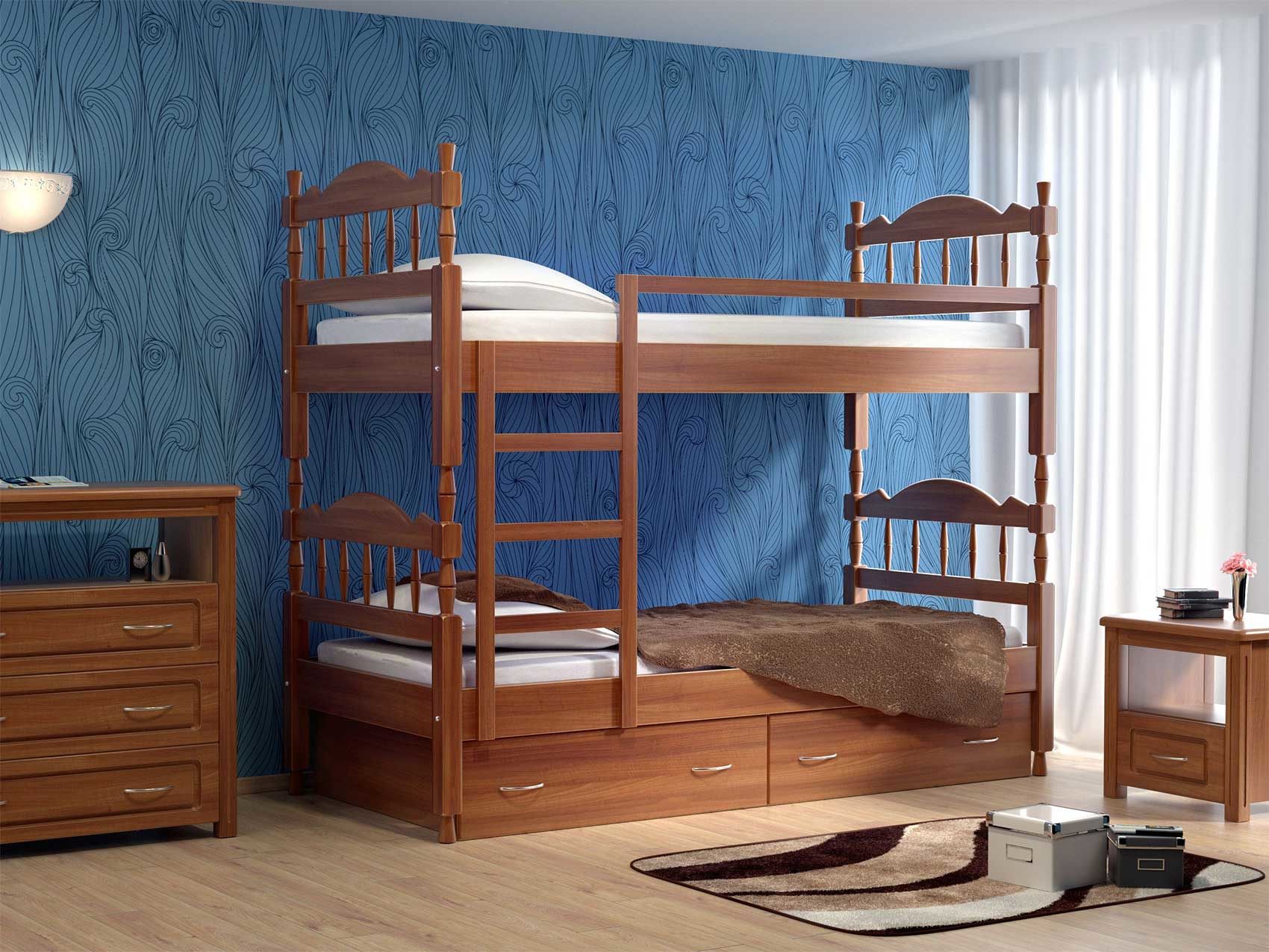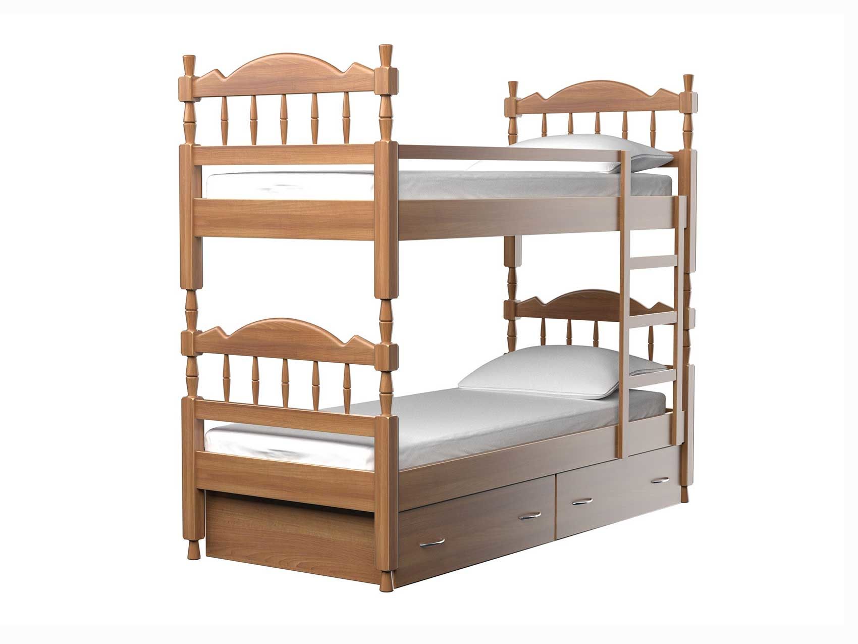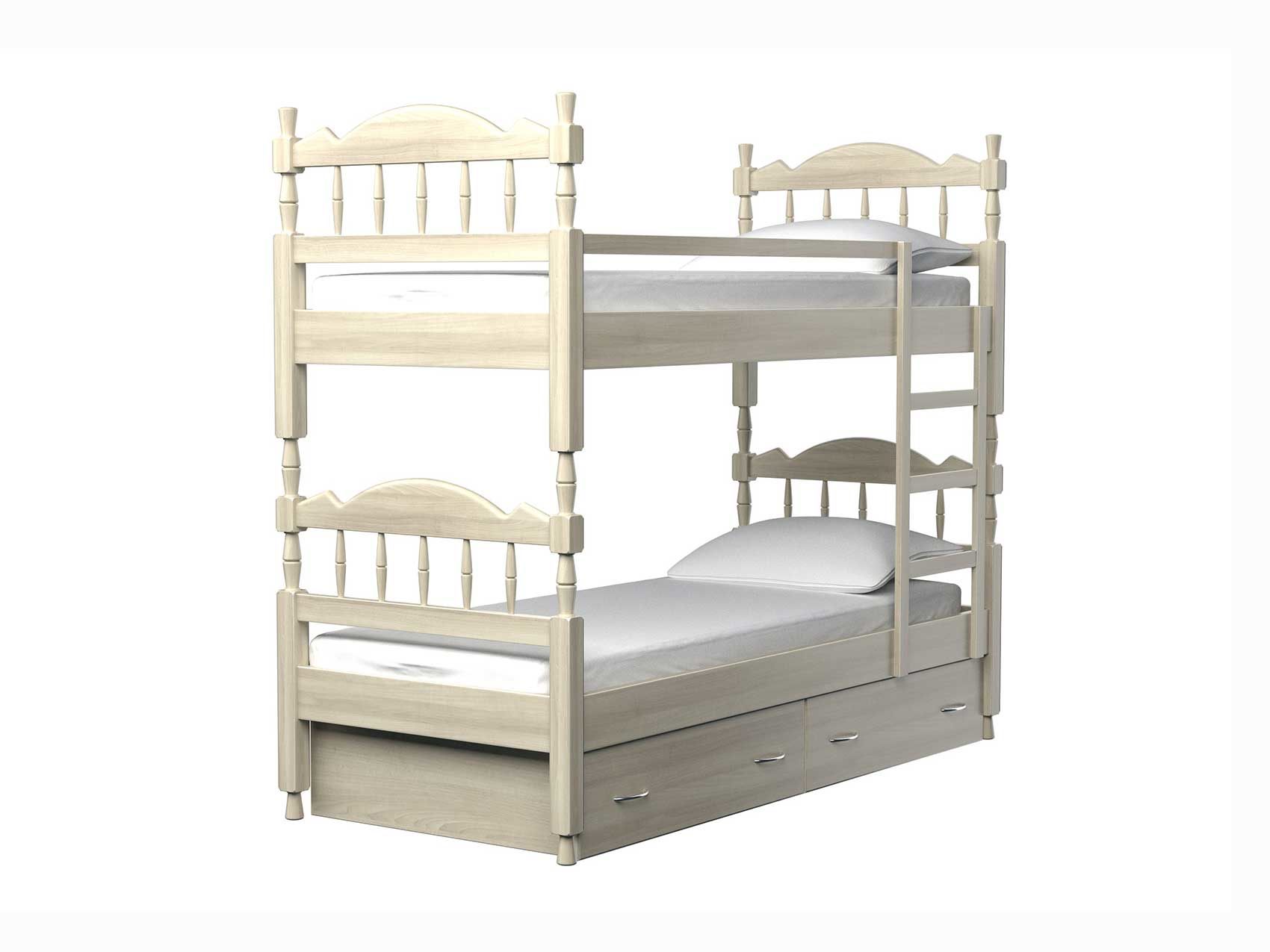 Удобная двухъярусная детская кровать с ящиками для хранения постельных принадлежностей и надежно закрепленной лестницей. Для обеспечения безопасности ребенка второй ярус оснащен бортиком-ограничителем, исключающим падение ребенка во время сна. Деревянная кровать из массива ясеня выполнена по индивидуальной технологии. Детская кровать подарит больше пространства и идеально впишется в интерьер детской комнаты. Вместительные встроенные ящики прекрасно позаботятся об игрушках и постельных принадлежностях. Кровать полностью выполнена из натурального дерева. Кровати из массива ценных пород дерева – гарантия экологической чистоты в Вашем доме.