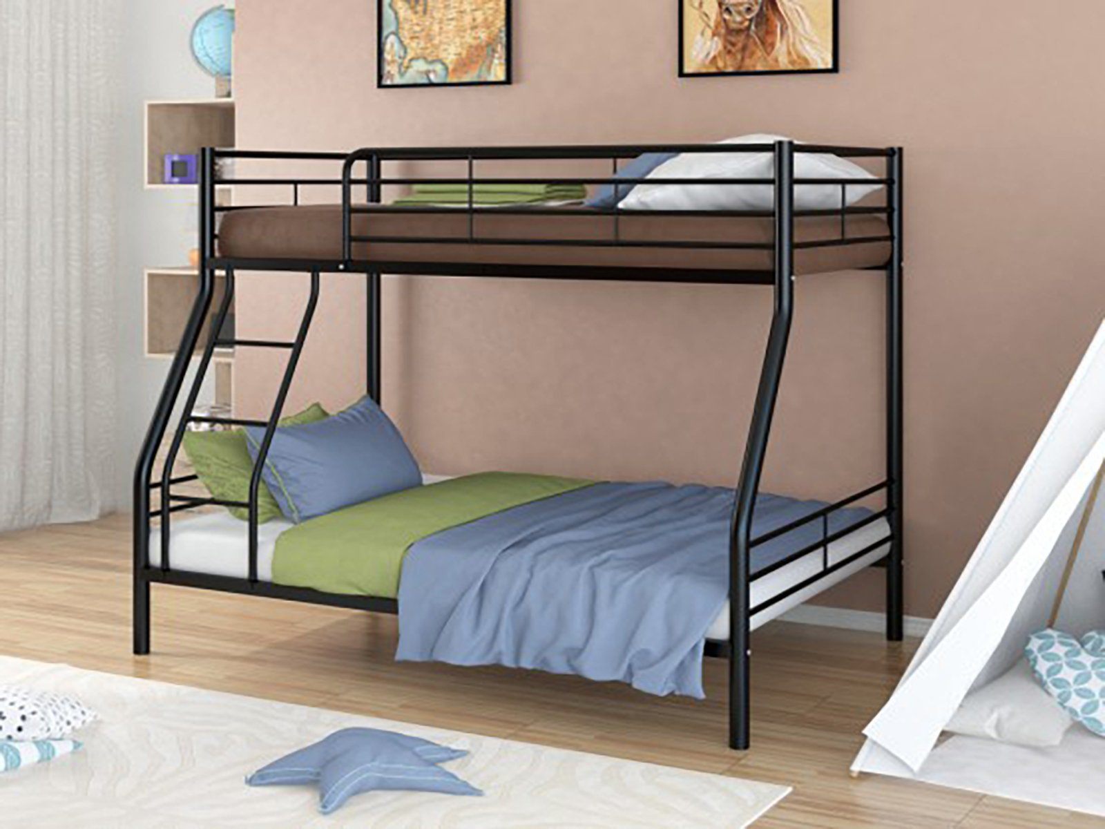 Все металлические элементы кровати покрыты износоустойчивой краской без запаха. Двухъярусную кровать можно собирать и разбирать неограниченное количество раз, и от этого она не потеряет в прочности и качестве.