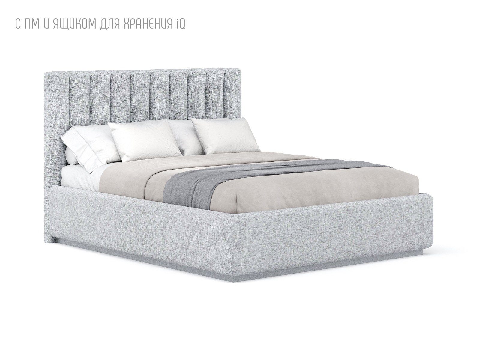 Кровать укомплектована IQ с подъемным механизмом и ящиком для белья без дна (дополнительная платная опция - дно к ящику IQ из HDF (ХДФ). Каркас кровати на цоколе, декоративный чехол на цоколе съёмный. Глубина ящика для белья - 30 см, без ограничения нагрузки на ящик.