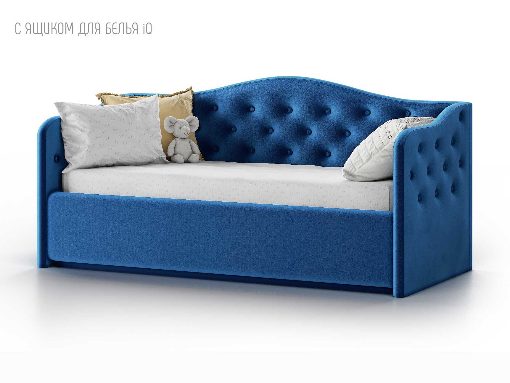 Кровать укомплектована IQ с подъемным механизмом и ящиком для белья без дна (дополнительная платная опция - дно к ящику IQ из HDF (ХДФ). Каркас кровати на цоколе, декоративный чехол на цоколе съёмный. Глубина ящика для белья - 30 см, без ограничения нагрузки на ящик.
