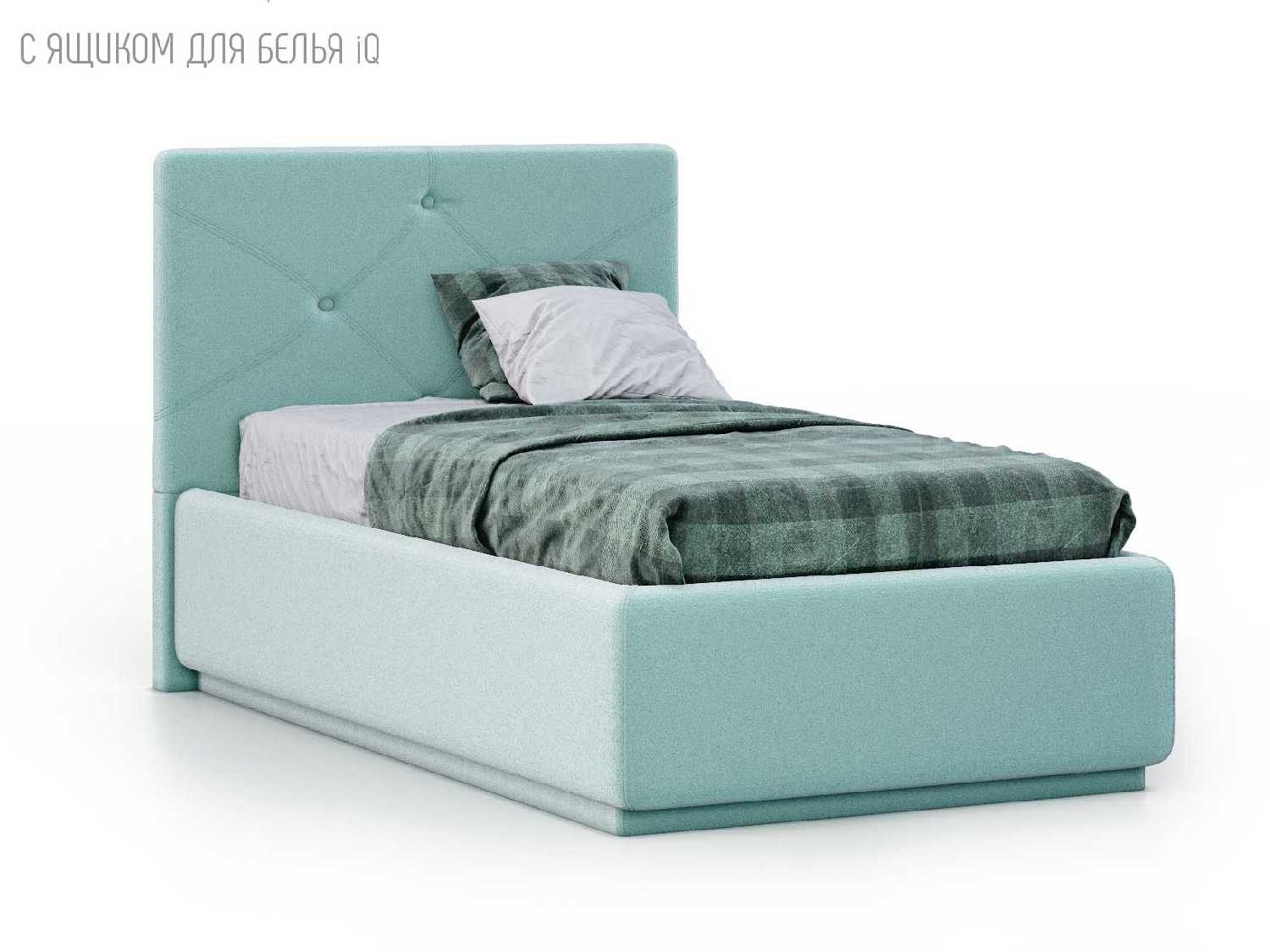 Кровать укомплектована IQ с подъемным механизмом и ящиком для белья без дна (дополнительная платная опция - дно к ящику IQ из HDF (ХДФ). Каркас кровати на цоколе, декоративный чехол на цоколе съёмный. Глубина ящика для белья - 30 см, без ограничения нагрузки на ящик.