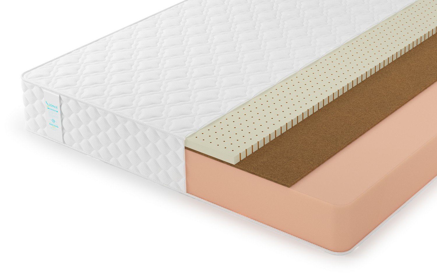 С одной из сторон ППУ установлено два дополнительных слоя: койра кокоса и натуральный латекс. Вместе они создают идеальный союз ортопедической поддержки и высокого адаптивного комфорта. Жёсткость и плотность койры обеспечивает правильное положение позвоночника, а латекс добавляет мягкость и эластичную подстройку под формы тела.