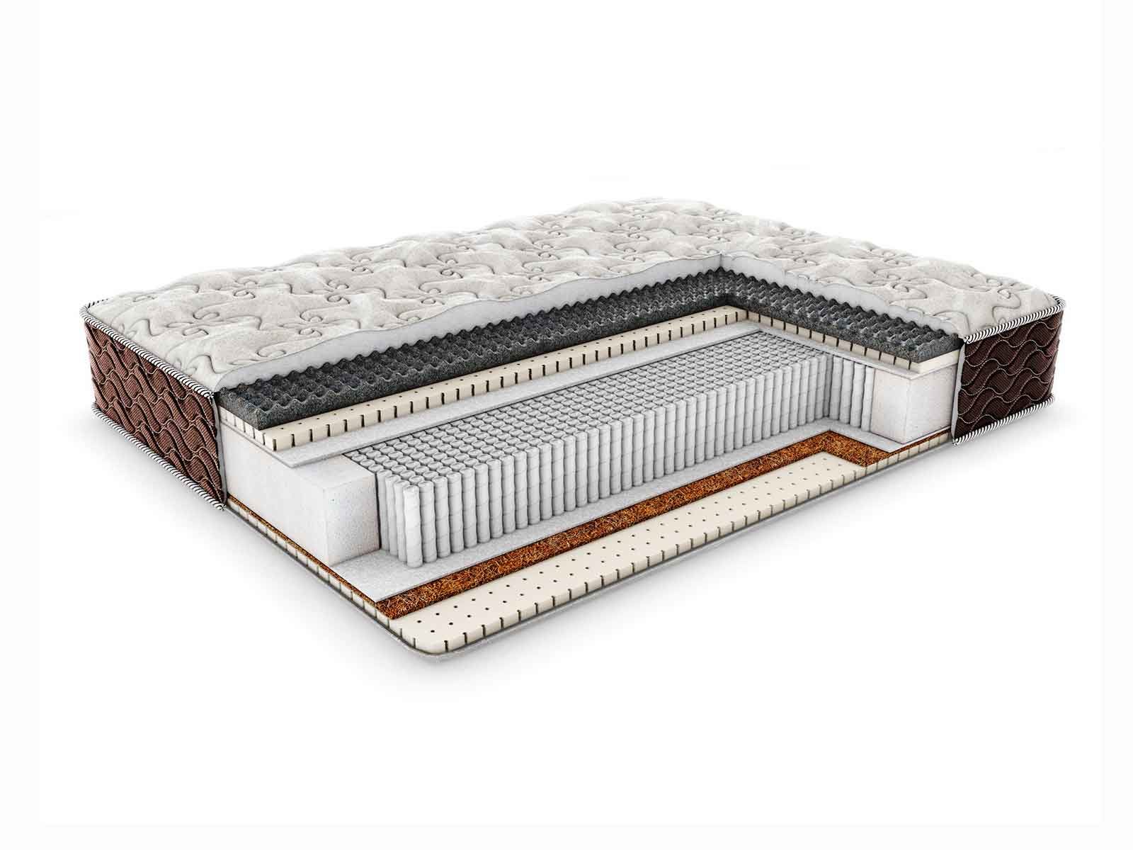 Чехол: несъёмный, из плотной трикотажной ткани с содержанием льна, простёган на искусственном волокне Холлкон (300 гр) и 0,8 см пены - пышность и объём. Бурлет матраса выполнен из плотного мебельного жаккарда шоколадного цвета, простёганного на ППУ 1 см — усиление периметра, сохранение геометрии матраса на протяжении всего срока службы.