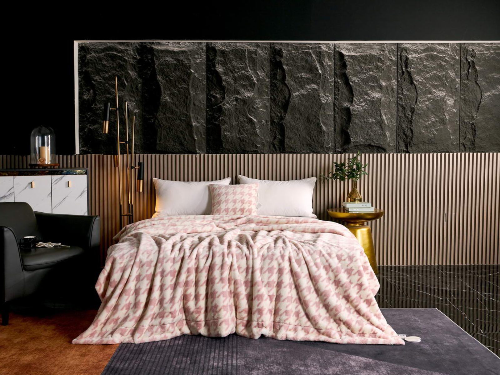 Sofi De Marko представляет вашему вниманию коллекцию Эрнесто, включающую в себя пледы и декоративные наволочки из искусственного меха с принтом «гусиная лапка».