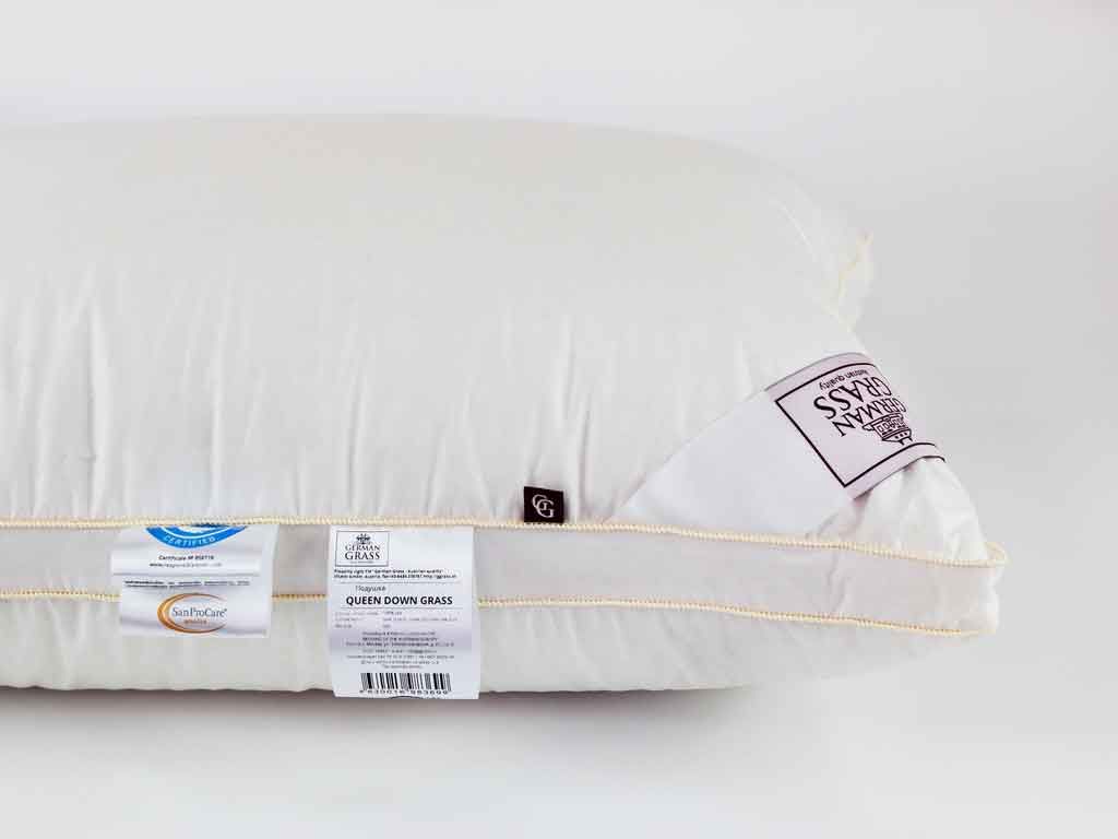Объемная и высокая подушка Queen Down Grass с бортиком сочетает в себе великолепные немецкие ткани большой плотности и натуральный гусиный пух высшей категории качества.