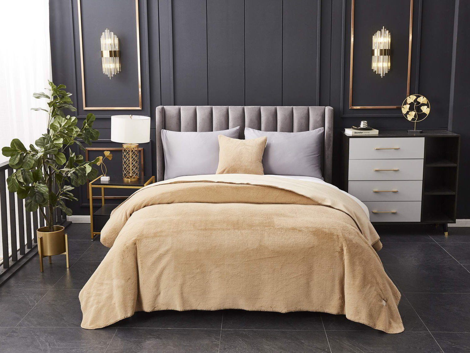 Мягким пледом можно укрываться, используя его как одеяло. Подушки в наволочках, подобранные в тон, дополнят интерьер.