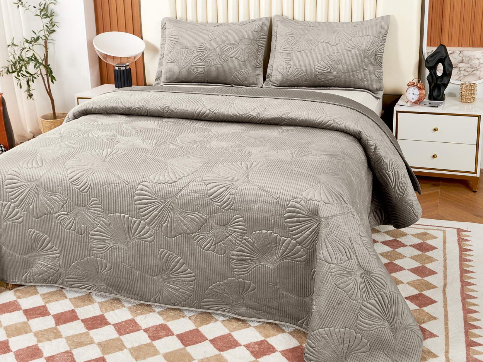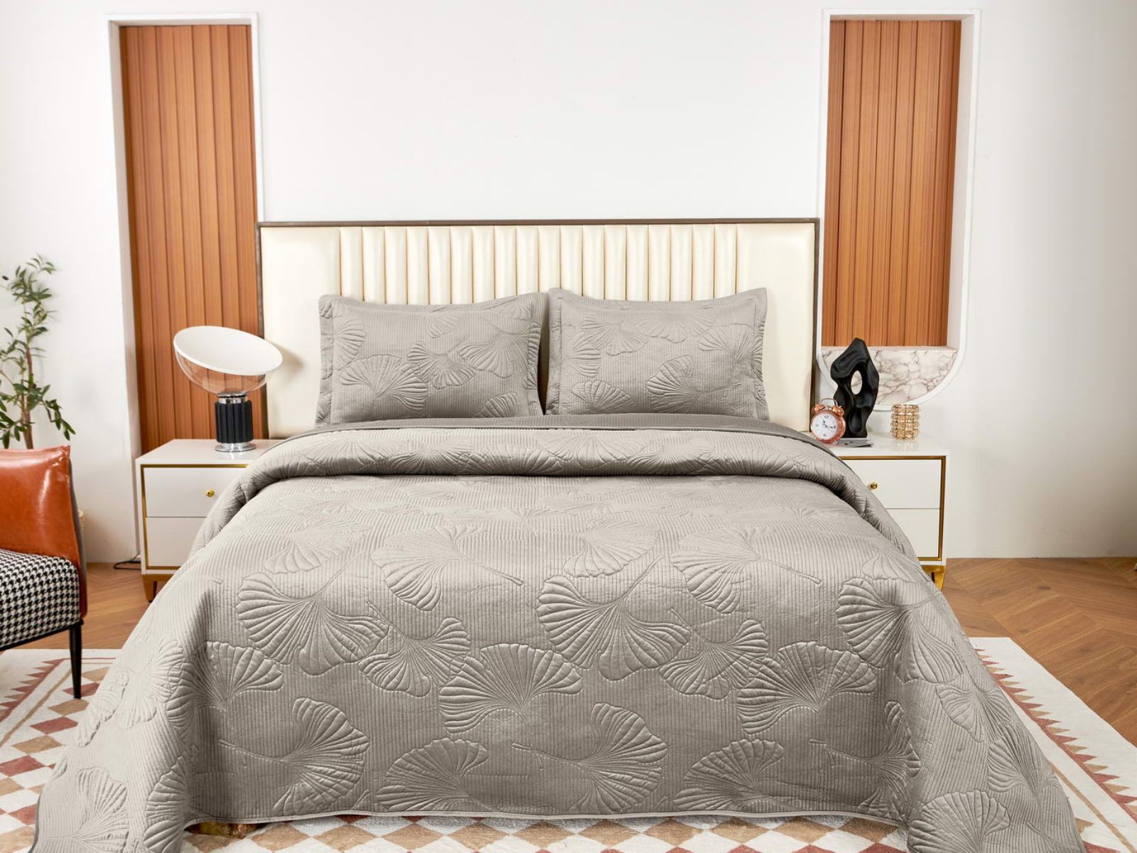 Роскошный растительный орнамент в виде вышивки добавит Вашей спальне элегантности и изысканности. Текстура цветочного узора будет сочетаться с другими элементами интерьера, такими как шторы, подушки, ковры и т.д.