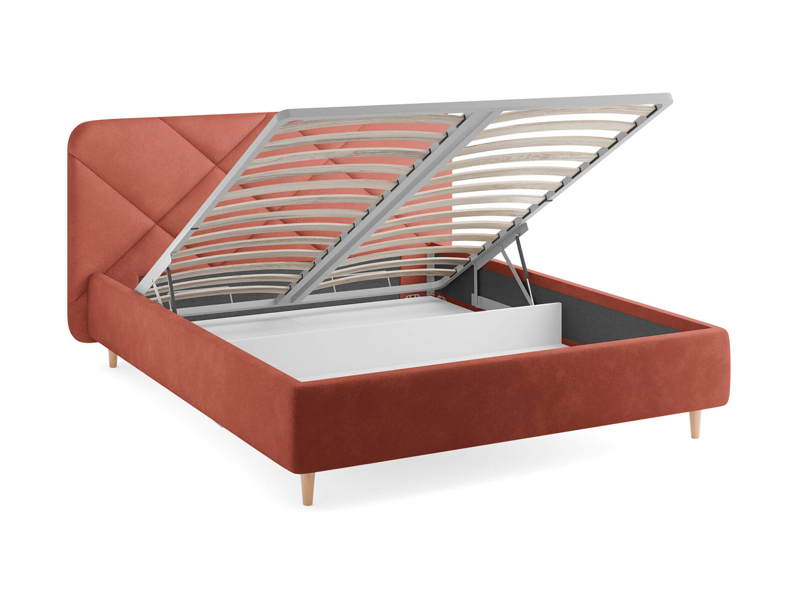Основание кровати на деревянных ножках. Благодаря увеличенной высоте позволяют осуществлять легкую уборку под кроватью, даже с помощью робота-пылесоса.